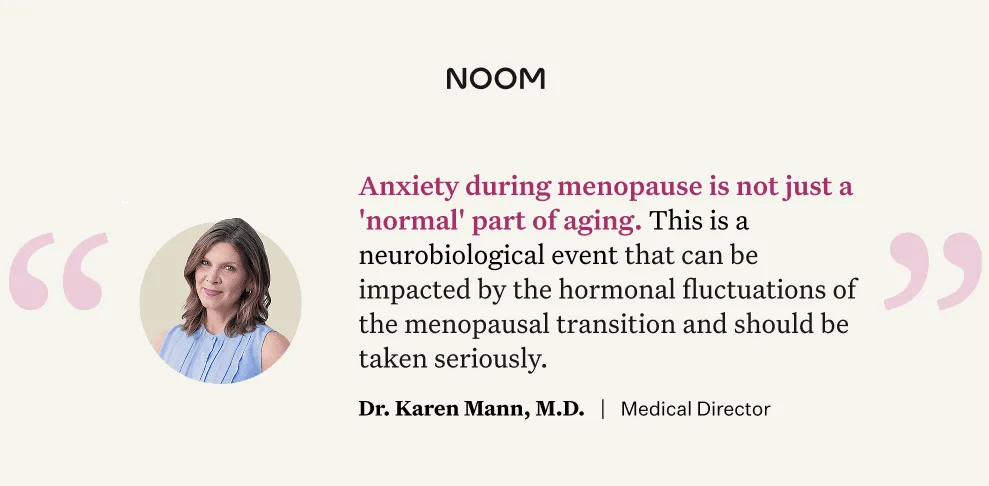 “The data really underscores that anxiety during menopause is not just a ‘normal’ part of aging. This is a neurobiological event,” says Dr. Karen Mann, MD, an OB-GYN and Noom Medical Director. “It’s important that doctors stop minimizing these symptoms as simply a consequence of aging or stress and instead recognize them for what they are. It’s a legitimate medical condition that can be impacted by the hormonal fluctuations of the menopausal transition and should be taken seriously.”