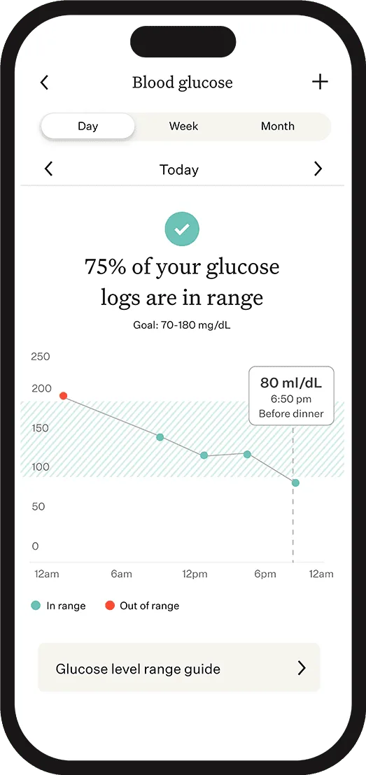 Noom integrates key lifestyle factors with blood glucose monitoring to highlight patterns that impact time in range, empowering smarter decisions.*